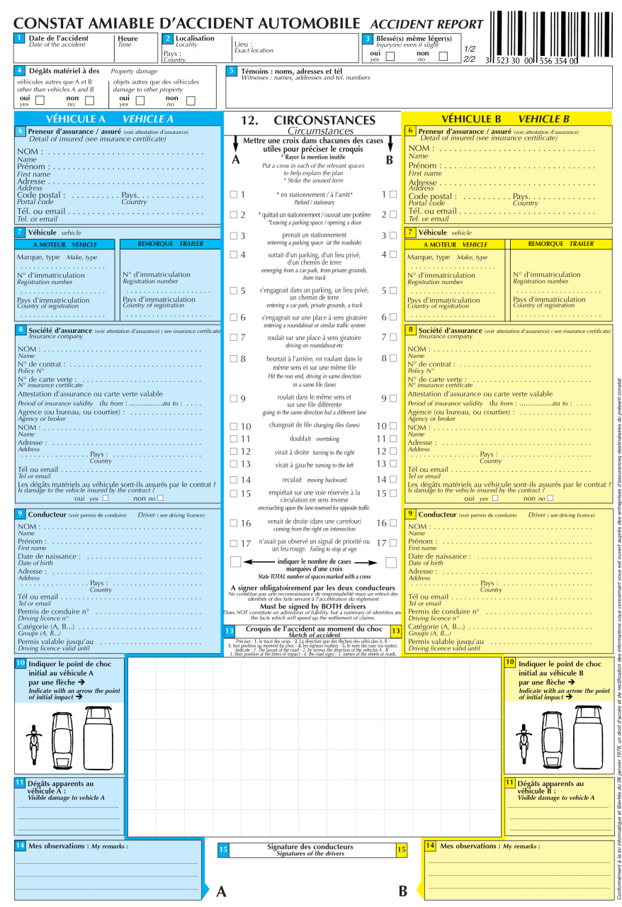 Il est conseillé de remplir un constat sur les lieux de l’accident avec le conducteur impliqué. Ensuite, chaque conducteur conserve un exemplaire du constat signé conjointement. La partie déclaration au dos de cette page peut se compléter individuellement par chacun des conducteurs.